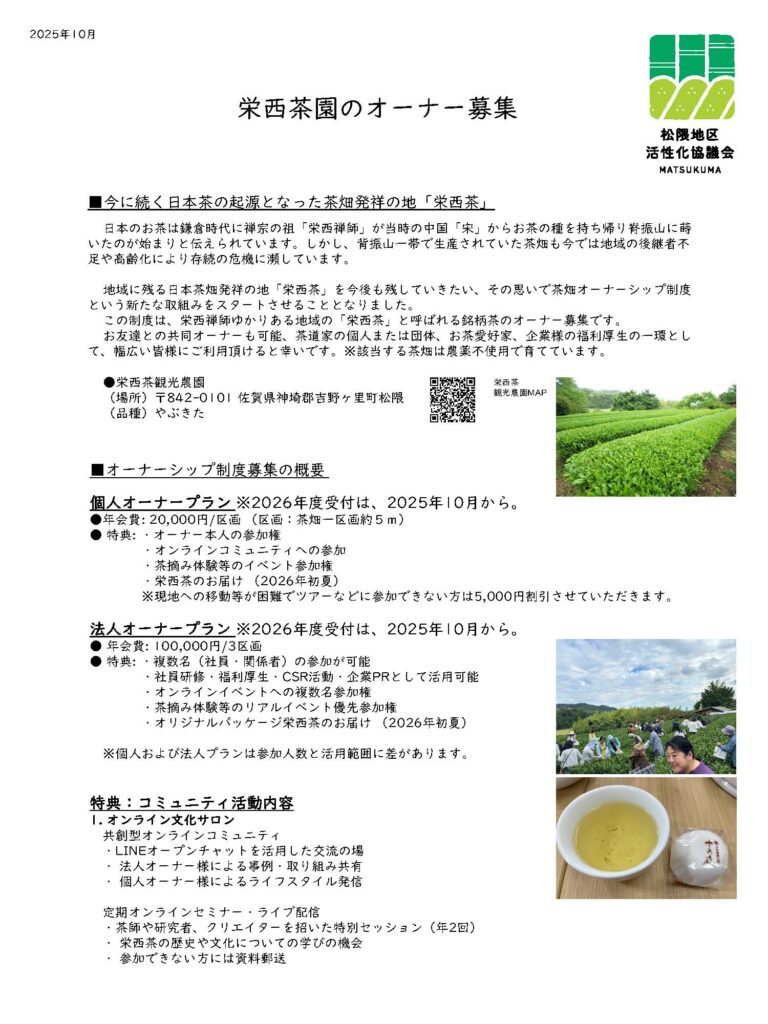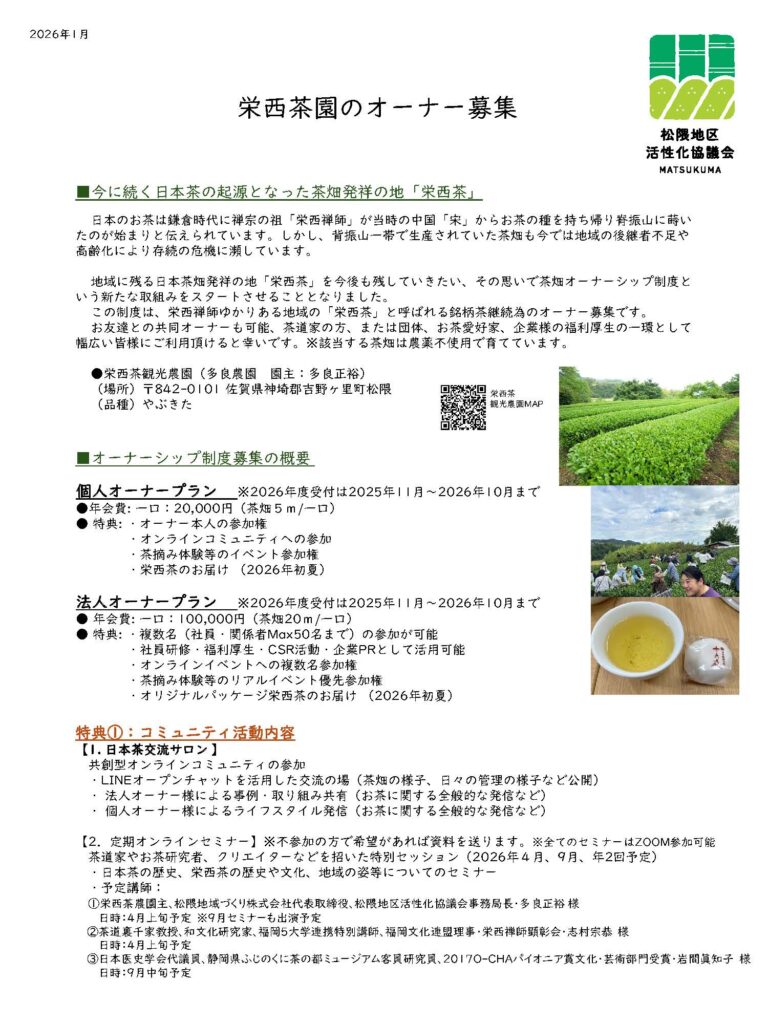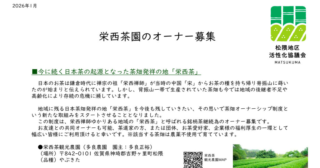 吉野ヶ里町松隈地区は、佐賀県の北東部に位置する約40戸の小さな集落です。近くには吉野ヶ里歴史公園や日本茶樹栽培発祥の地などがあり、歴史や自然を楽しめます。